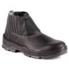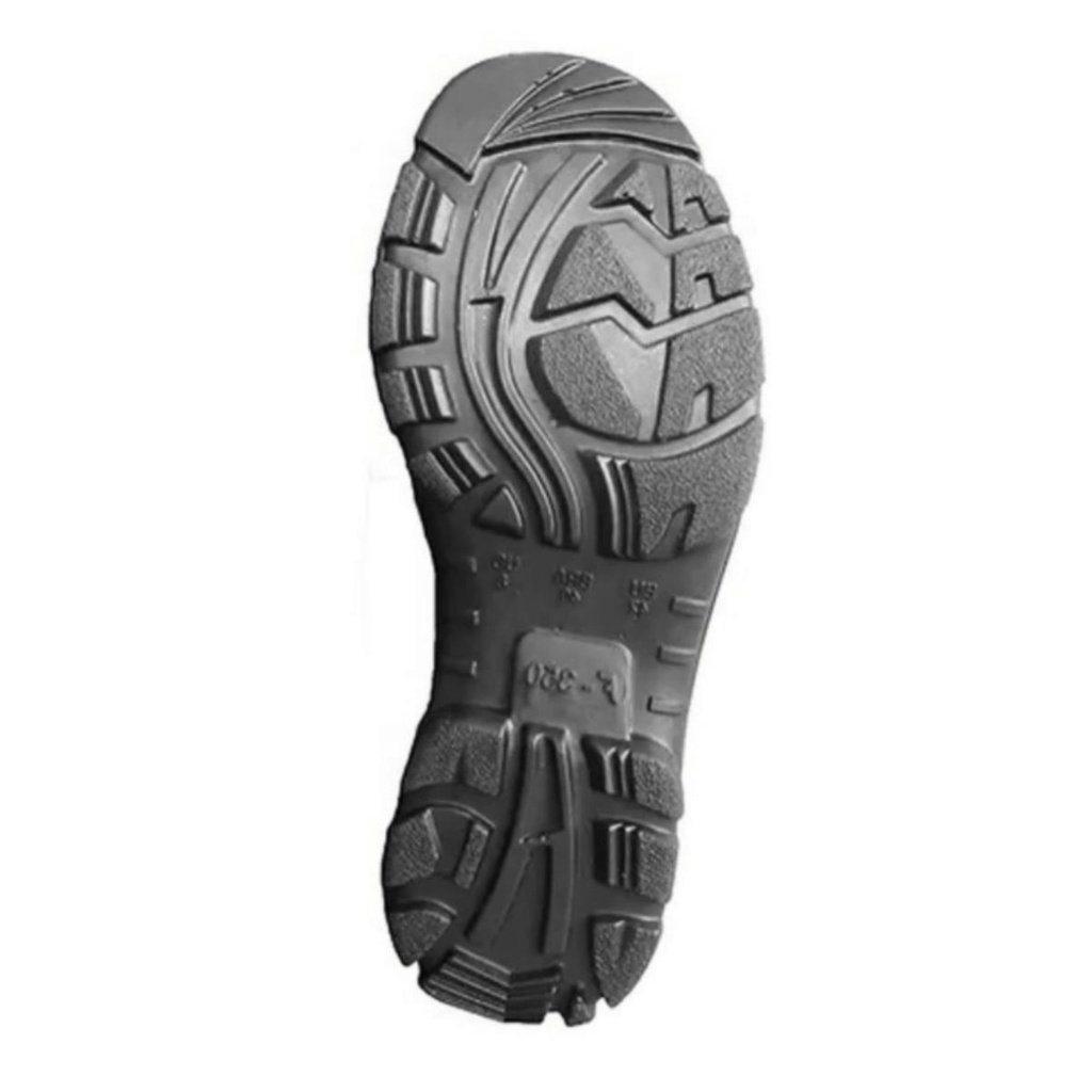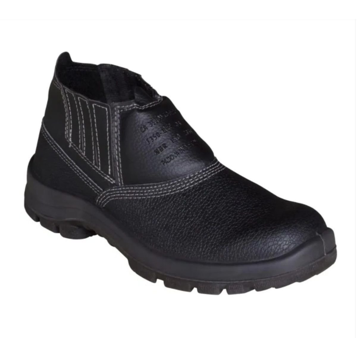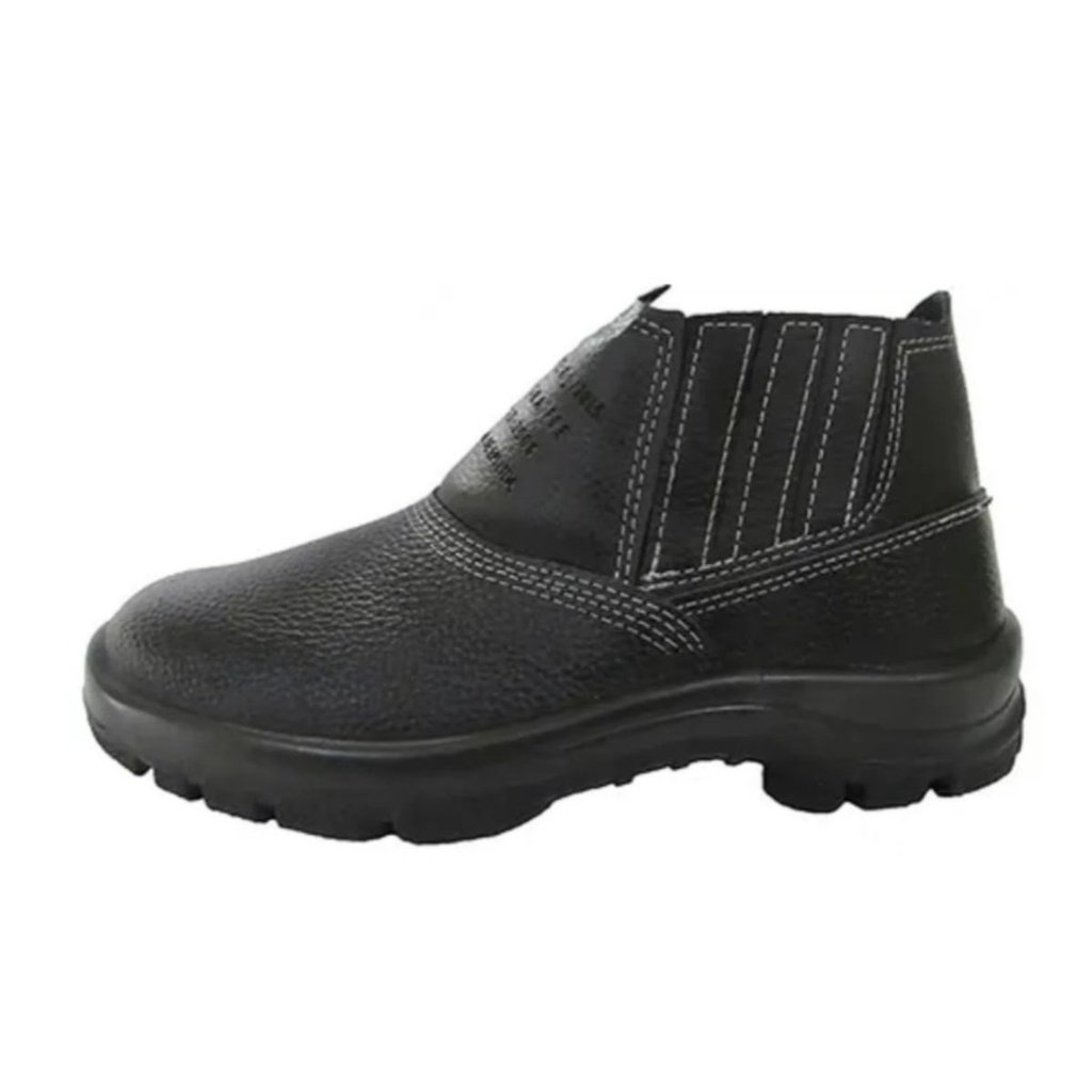 Calçado de segurança básico, modelo botina, constituída de couro, desenho do cabedal tipo (B), fechamento em elástico. Sistema strobel com palmilha de montagem em não tecido e injeção direta do solado no cabedal. Região do salto totalmente fechado, com resistência ao escorregamento, solado monodensidade, com bico de aço.