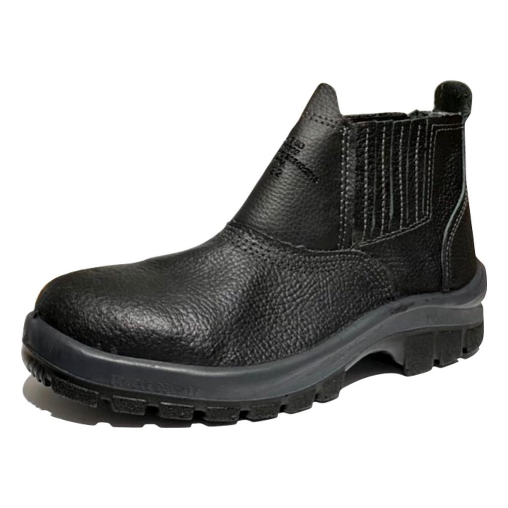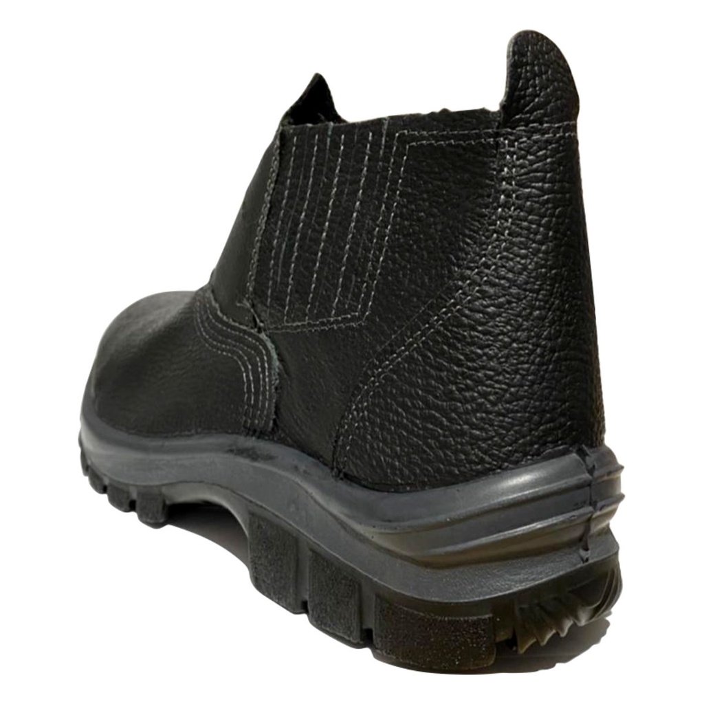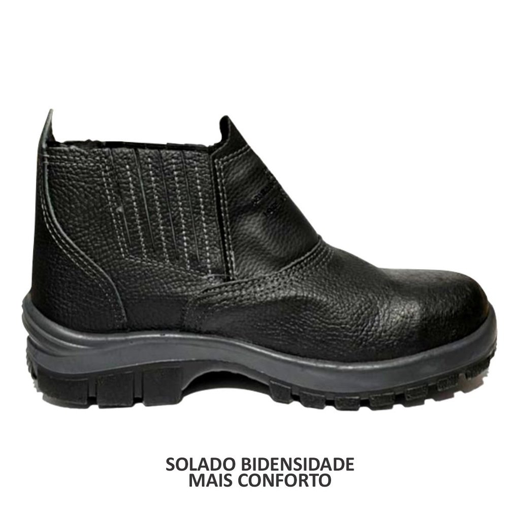 Botina em Couro com fechamento em Elástico e Biqueira de PVC, Solado Bidensidade e Palmilha em EVA trazendo mais conforto ao usuario.