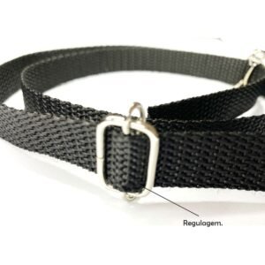 -Modelo confeccionado em material têxtil (poliéster com velcro) dispõe de regulagem por dentes de 15 mm em nylon.