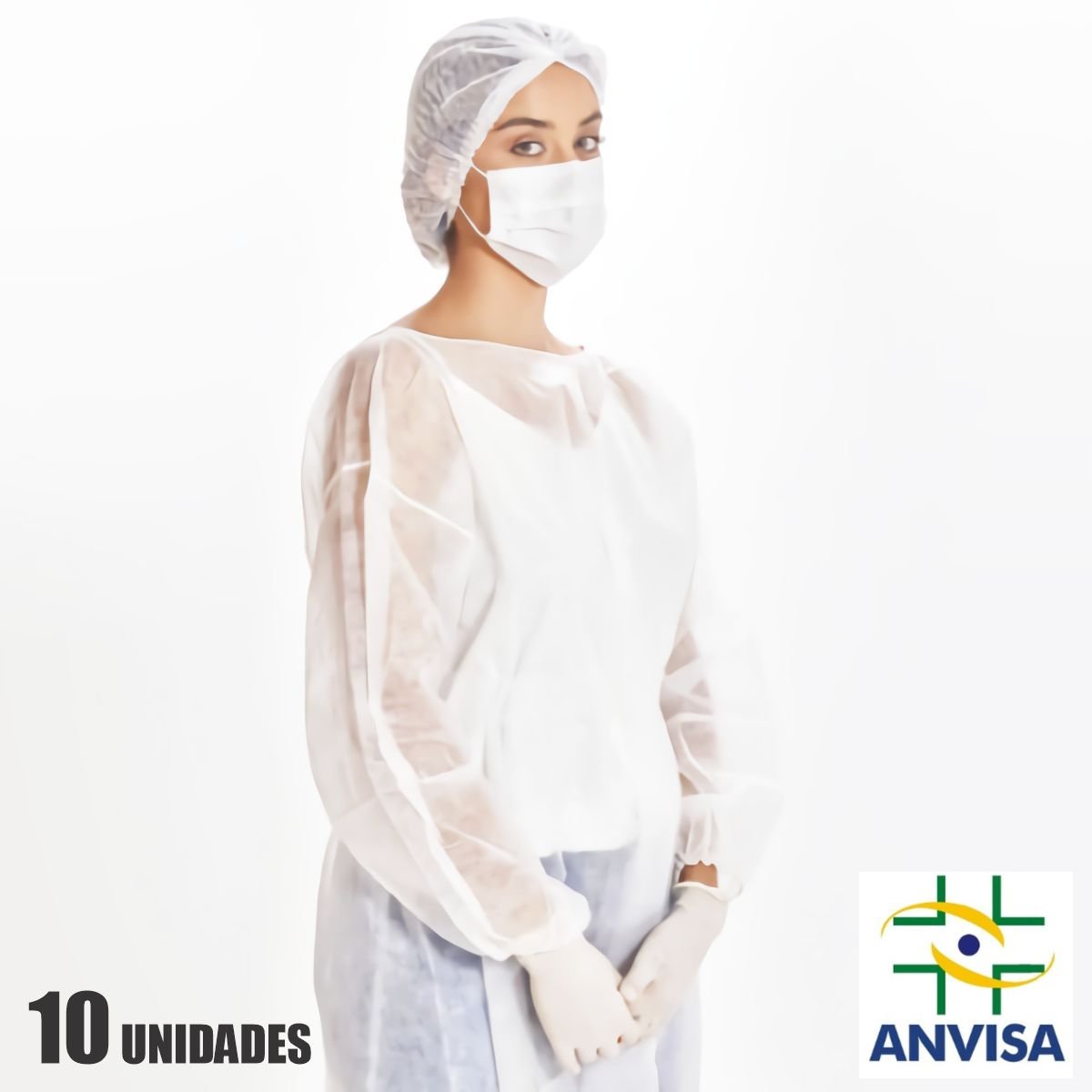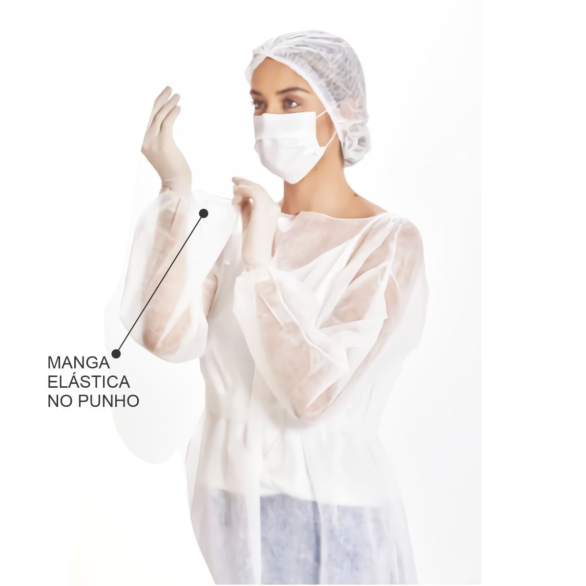 Avental fabricado em TNT gramatura 40 com alta qualidade, oferecendo resistência e durabilidade, não estéril, hipoalérgico e atóxico, com mangas longas e punho com elástico.