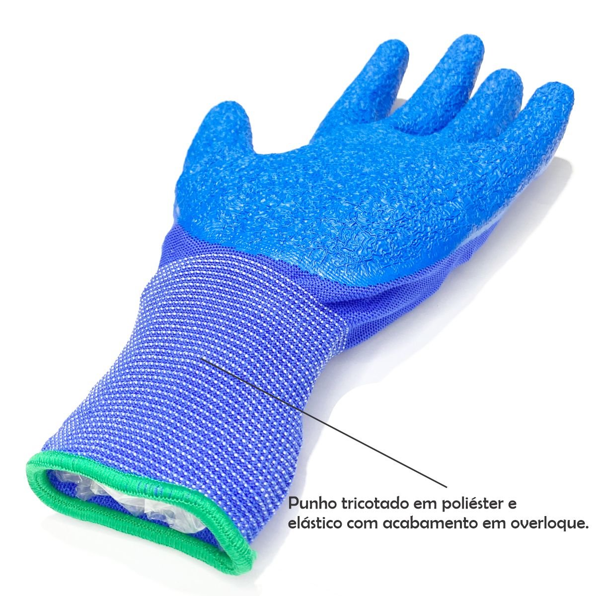 Luva de segurança tricotada em os de poliéster na palma, face palmar, dedos, extremidade dos dedos revestido em látex natural corrugado antiderrapante, com dorso (ventilado). Punho tricotado em poliéster e elástico com acabamento em overloque.