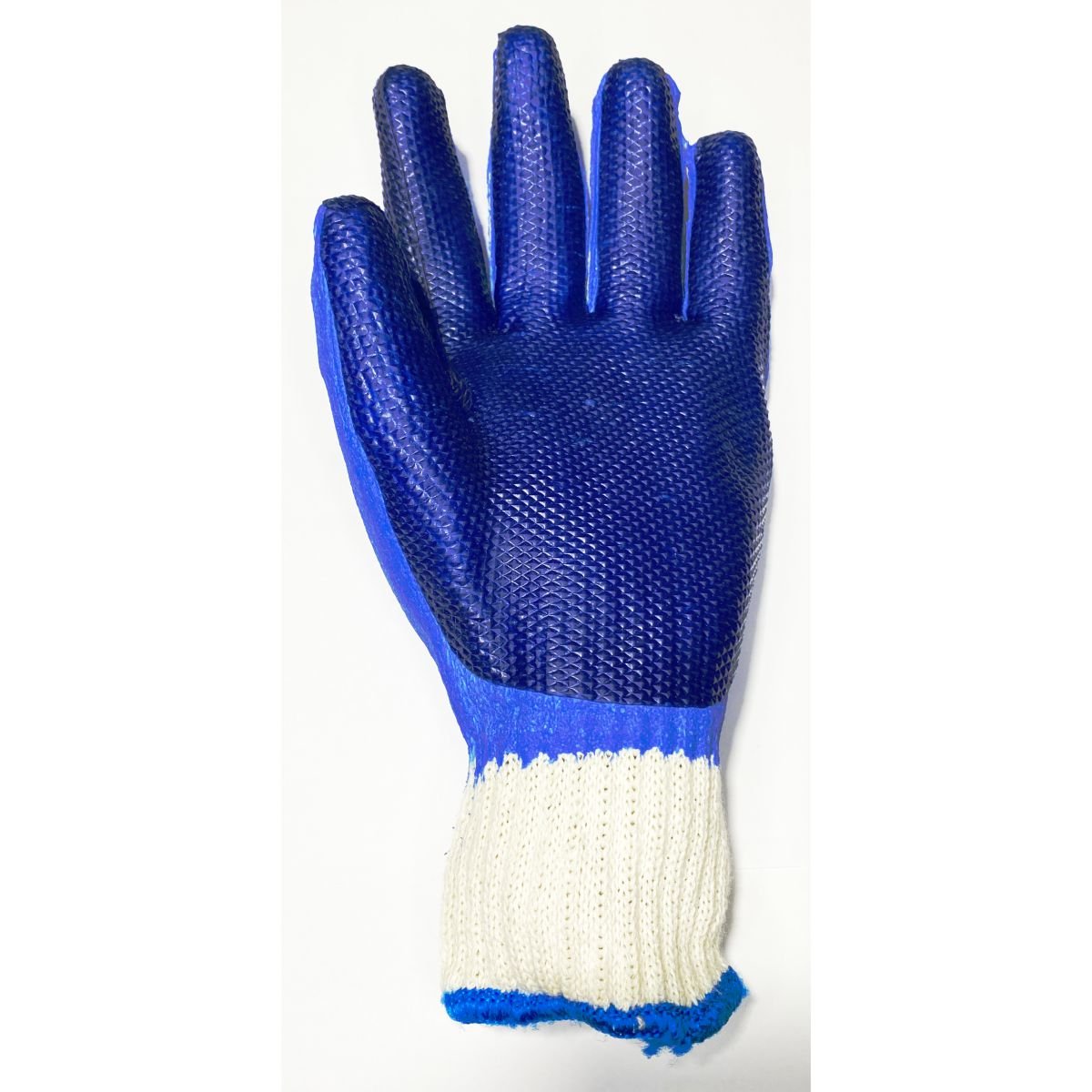Luva de segurança tricotada em algodão, poliéster e elastômero com revestimento antiderrapante vulcanizado, em formato de diamante, de látex natural na palma, face palmar dos dedos e pontas dos dedos (unheira), com reforço de borracha natural entre os dedos polegar e indicador (região da pinça), punho tricotado em algodão, com acabamento em overloque.