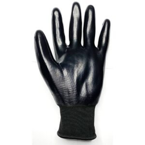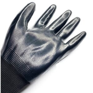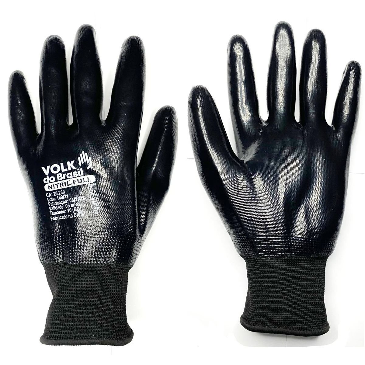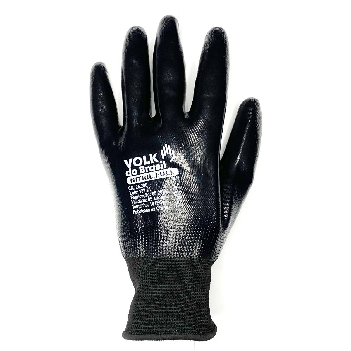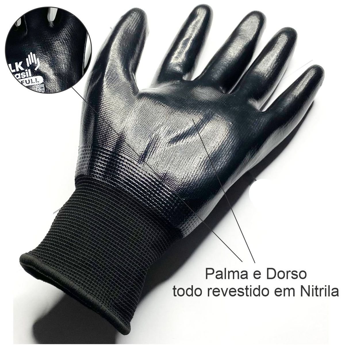 Luva de segurança confeccionada em fibras sintéticas, totalmente revestida com nitrila, lisa, punho em fibras elásticas e acabamento em fibras sintéticas.