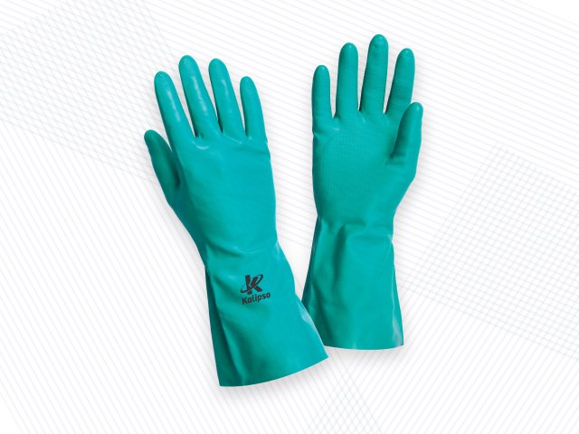 Luva de segurança confeccionada em látex nitrílico, forrada internamente com flocos de algodão, antiderrapante na palma, face palmar dos dedos e extremidade dos dedos.
