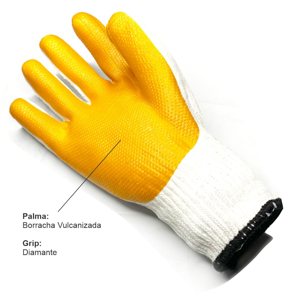 Luva de segurança confeccionada em fibras naturais, 10 gauge, revestida com borracha vulcanizada na palma, punho com fibras elásticas e acabamento com fibras sintéticas.