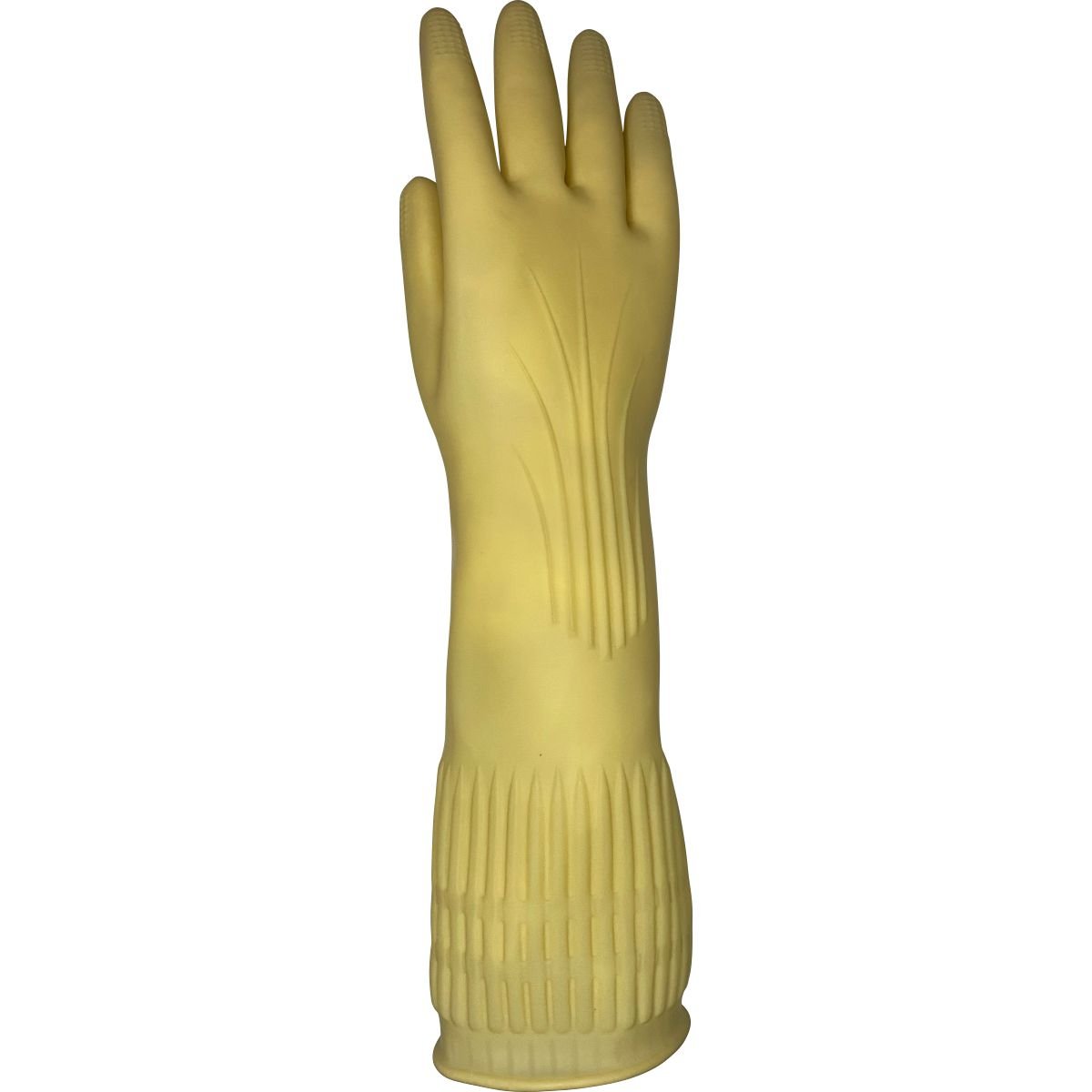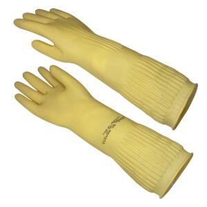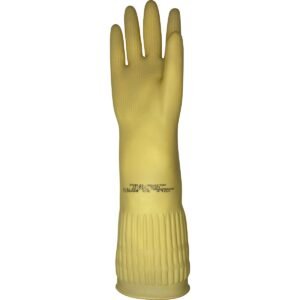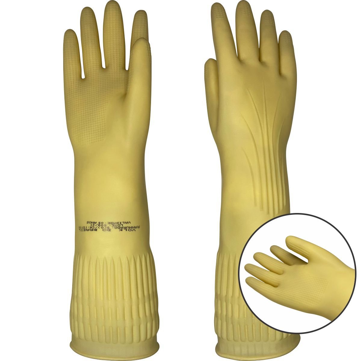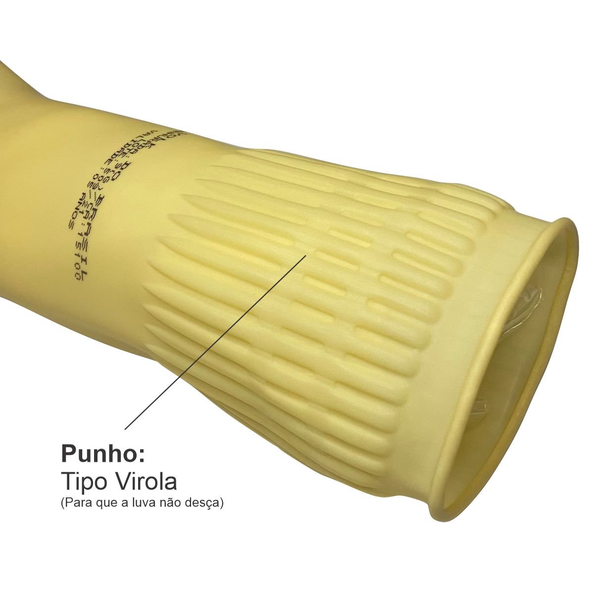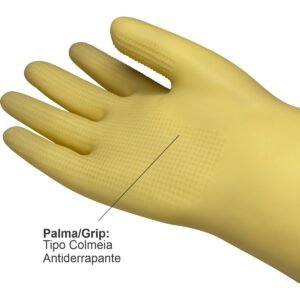 Luva de segurança confeccionada em látex natural, relevo antiderrapante na palma e ponta dos dedos, detalhes de ranhura no punho.