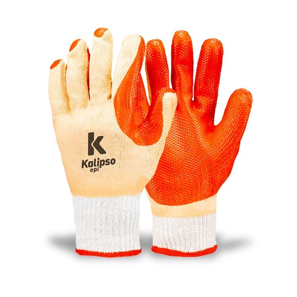 Luva de proteção, tricotada em algodão, poliéster e elastômero com revestimento antiderrapante vulcanizado, em formato de diamante, de látex natural na palma, face, palmar dos dedos e ponta dos dedos (unheira), com reforço de borracha natural entre os dedos polegar e indicador (região da “pinça”). Punho tricotado em algodão, com acabamento em overloque.