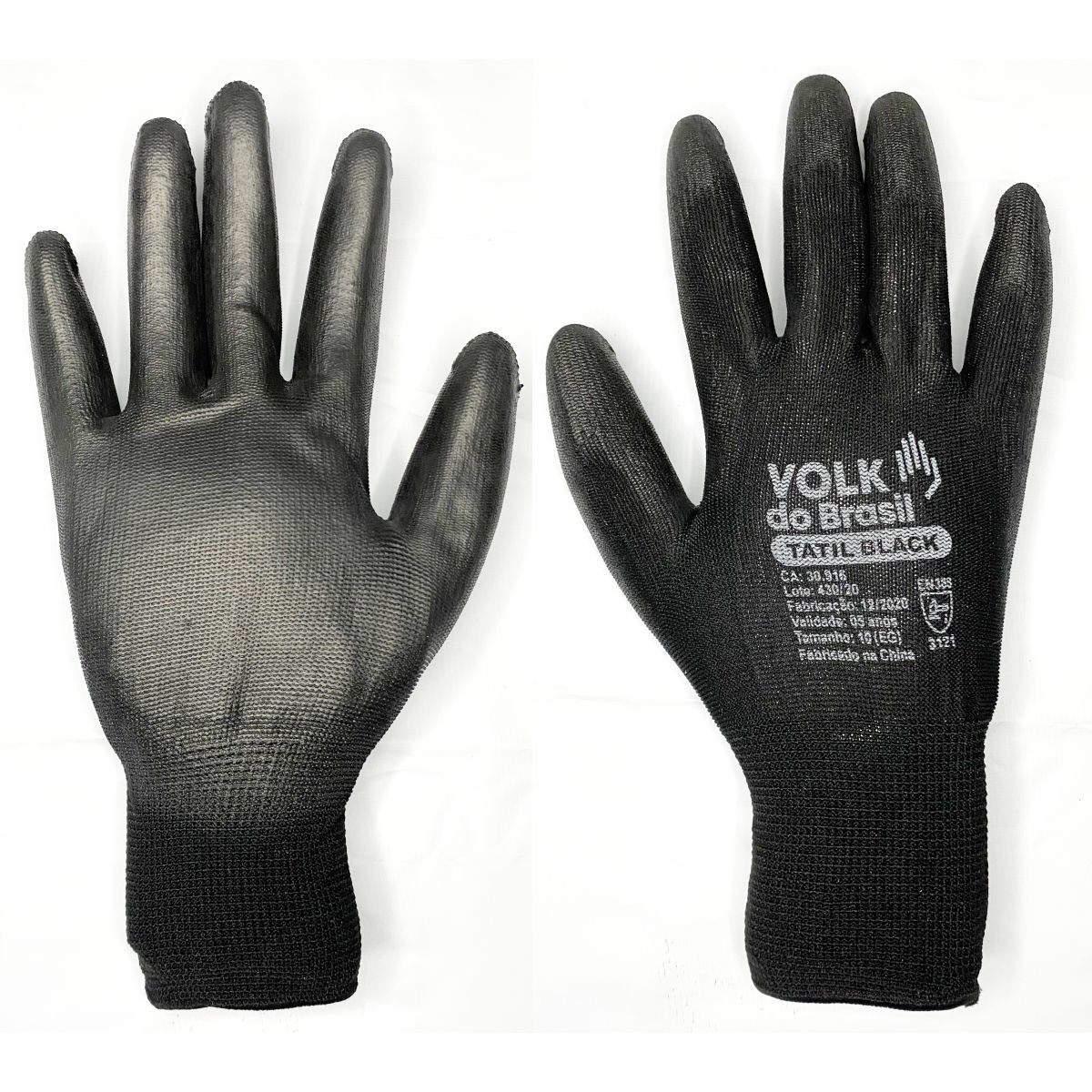 Luva de segurança confeccionada em fibras sintéticas, revestimento da face palmar e ponta dos dedos em poliuretano (PU), punho com inserções de fibras elásticas e acabamento em fibras sintéticas.