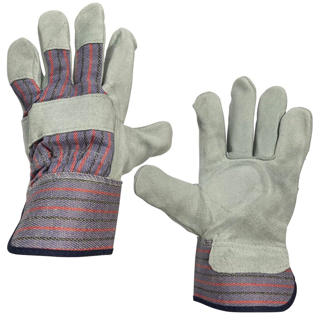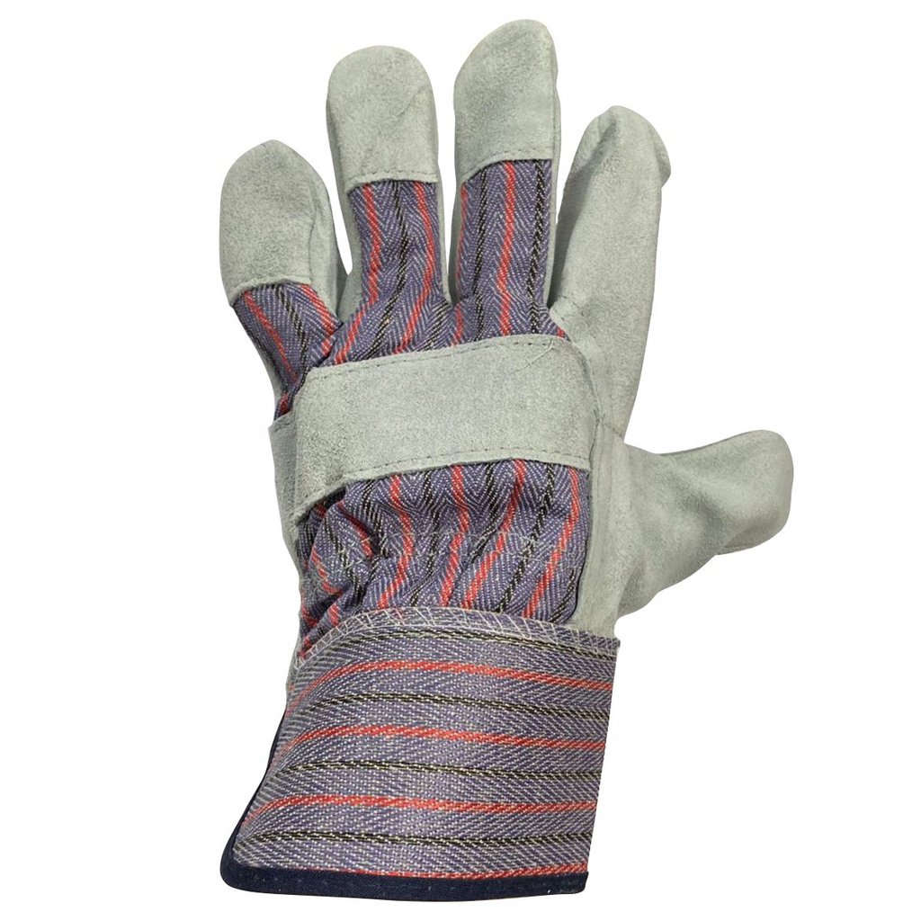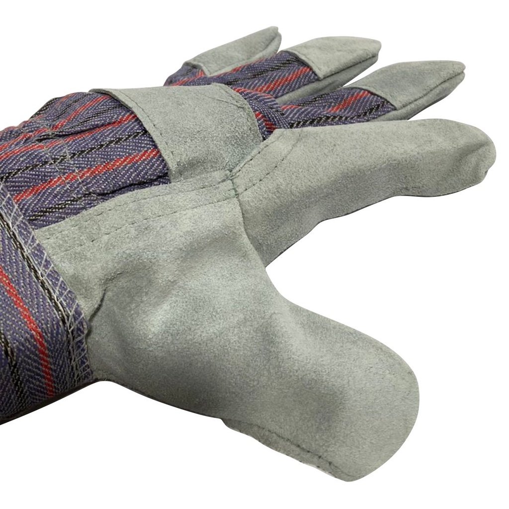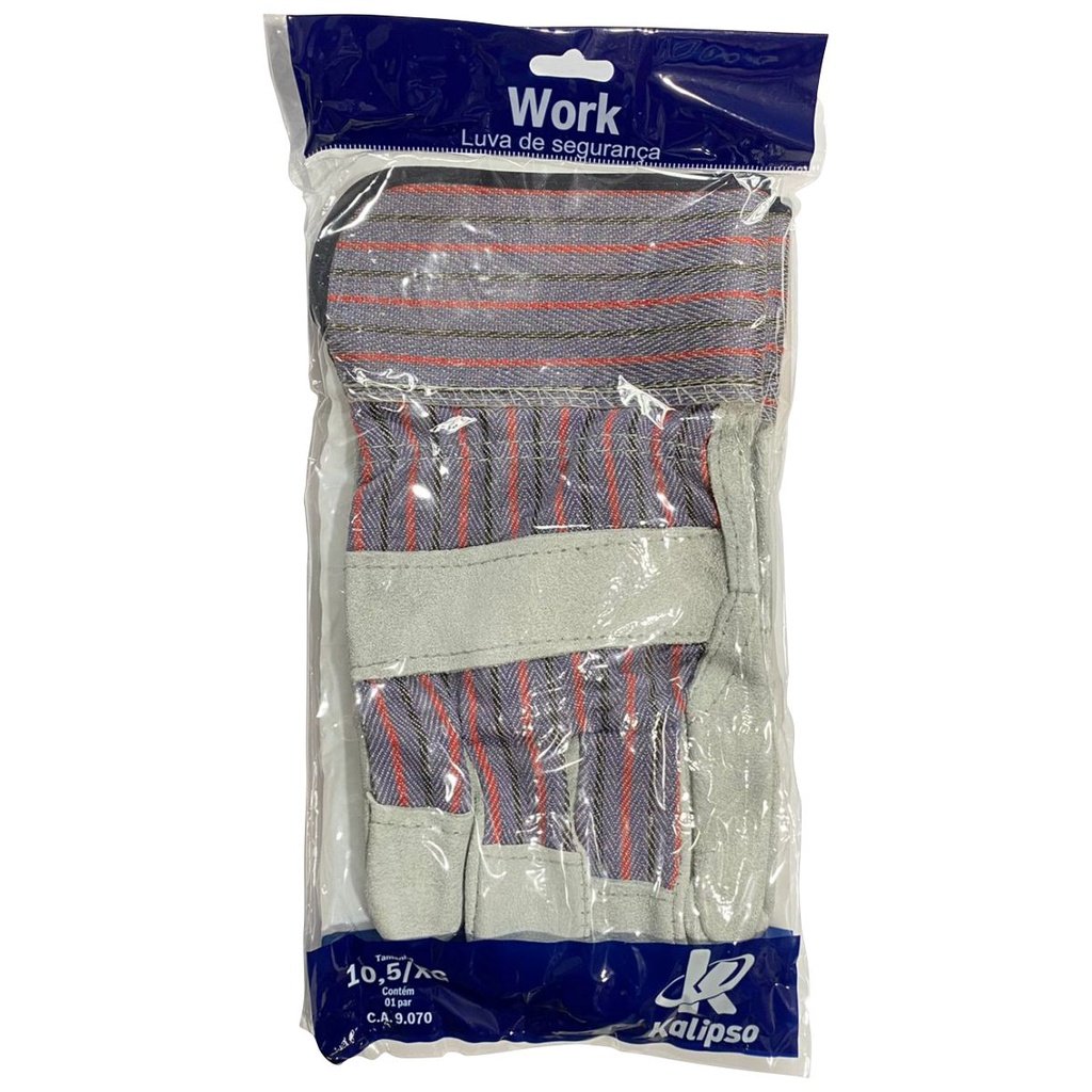 Luva de segurança confeccionada em raspa na face palmar, parte do punho e extremidade dos dedos (unheira), com revestimento total em raspa no 1º e 2º dedos da luva, dorso confeccionado em tecido com reforço externo em raspa na região do metacarpo, revestimento em tecido flanelado na parte interna da palma, acabamento da costura na face palmar com reforço de couro, acabamento do punho em lona.