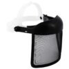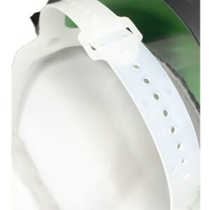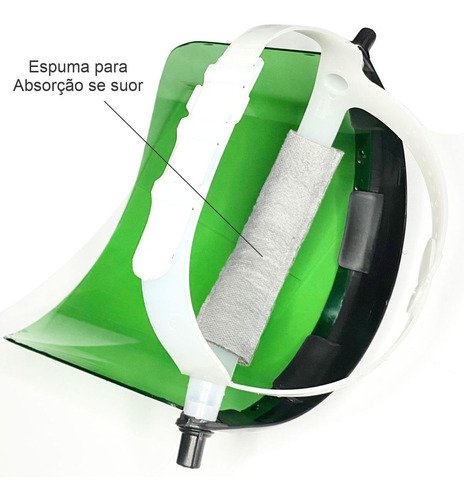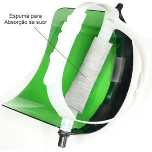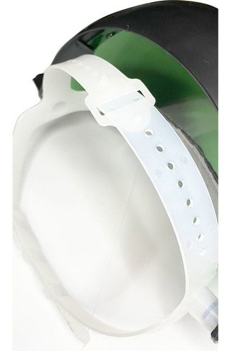 Testeira em material plástico resistente com tira absorvedora de suor, que pode ser facilmente removida para substituição ou evitar riscos de contaminação.