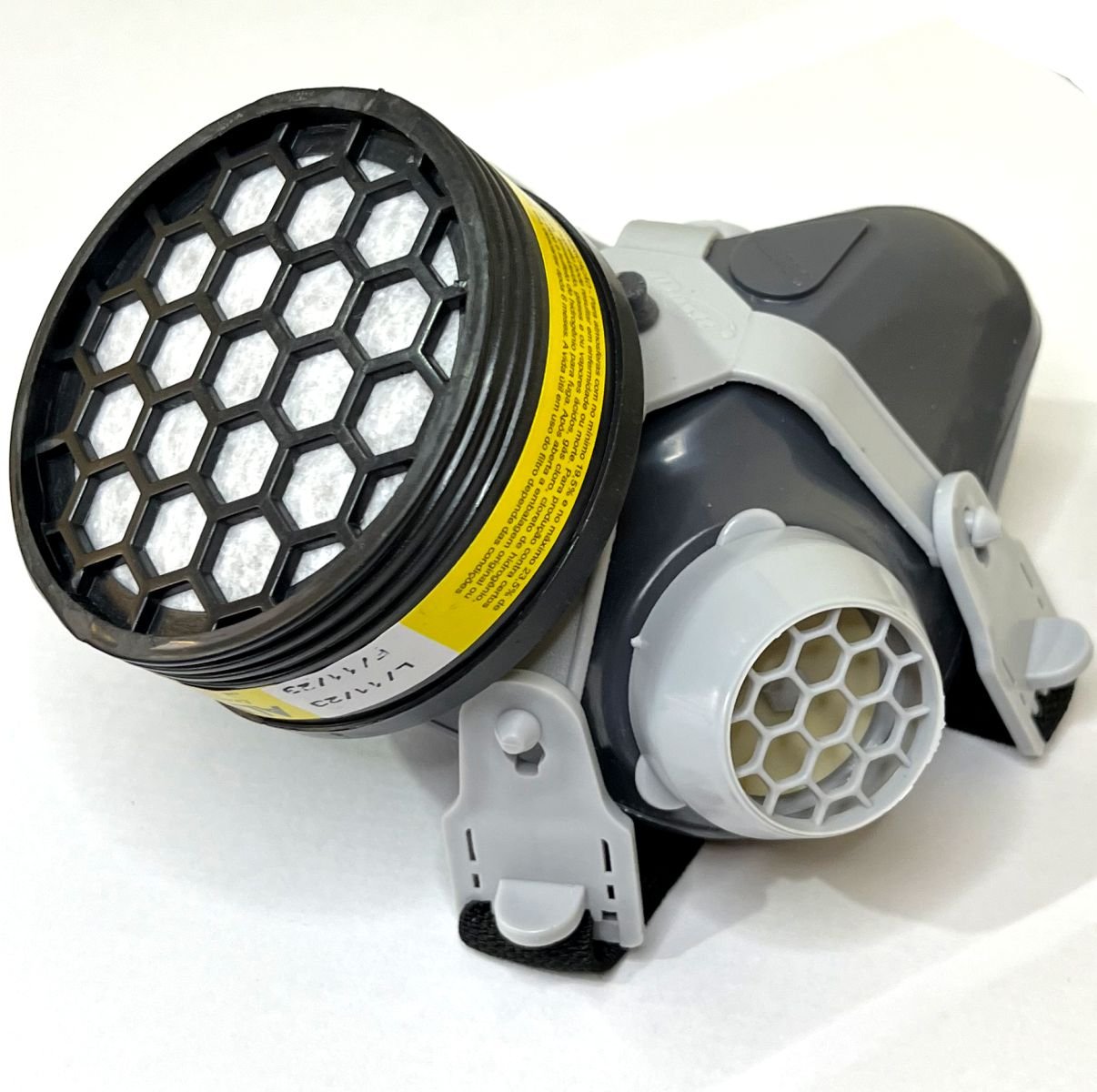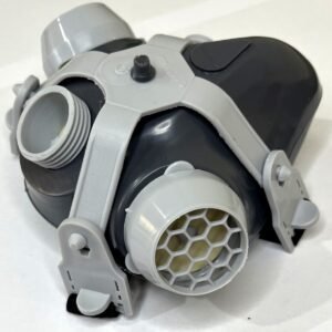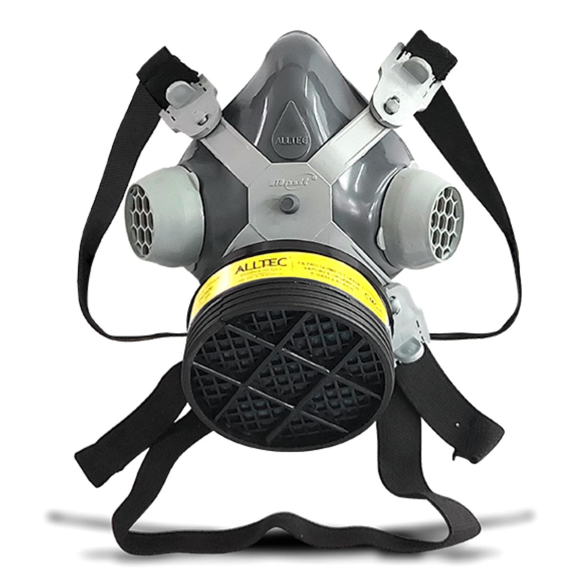Respirador purificador de ar tipo peça um quarto facial, tamanho único, com corpo confeccionado em elastômero na cor cinza, com borda interna. Nas laterais do corpo da peça, estão localizadas duas aberturas, uma de cada lado, nas quais são encaixados dois dispositivos de material plástico cinza claro, dotados, cada um, de uma válvula de exalação em sua parte interna e de uma tampa da mesma cor, com encaixe tipo pressão. A peça facial possui uma abertura localizada em sua parte centro-inferior, na qual é fixado um suporte plástico cinza claro, dotado de uma válvula de inalação em sua parte traseira e de uma rosca externa em sua parte dianteira, onde são rosqueados os filtros químicos e combinados. Os respiradores possuem, na parte central do corpo, um ponto (saliência) para o encaixe de um suporte plástico cinza claro, marcado indelevelmente com a inscrição “Mastt”. Este suporte é dotado de quatro hastes, onde são fixadas quatro fivelas plásticas cinza claro, através das quais passam as pontas de dois tirante elásticos ajustáveis na cor preta: um tirante localizado na parte superior e o outro, na parte inferior. O respirador é utilizado com os seguintes filtros: 1 – Filtros químicos classe 1: CMA-1 – vapores orgânicos; CMB-1 – gases ácidos; CMC-1 – vapores orgânicos e gases ácidos; CMD-1 – amônia e metilaminas; ABEK-1 – multigases: vapores orgânicos, gases ácidos, amônia e metilaminas; CMP-1 – vapores orgânicos mais poeiras e névoas e fumos (P2).